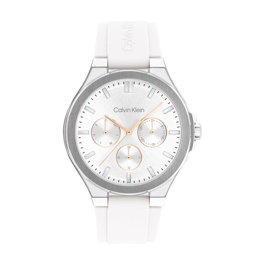 Часовник Calvin Klein Vibrancy 25100106 е стилен дамски модел с модерна спортно-елегантна визия. Корпусът е изработен от неръждаема стомана, комбиниран с удобна бяла силиконова каишка. Светлият мултифункционален циферблат със сребристи индекси и розово златисти стрелки предлага функции за дата, ден от седмицата и 24-часов формат.