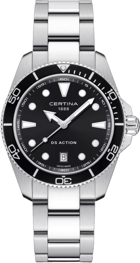 Часовник Certina DS Action 40mm за мъже с кварцов механизъм и черен циферблат. Изработен от висококачествена 316L стомана, с водоустойчивост до 100 м и сапфир кристал, този спортно-елегантен модел е идеален за ежедневна употреба и водни активности. Разполага с дата, луминесцентни стрелки и индекси. Стоманената верижка с пеперуда закопчалка се скъсява безплатно. Произведен в Швейцария, с гаранция 2 години.