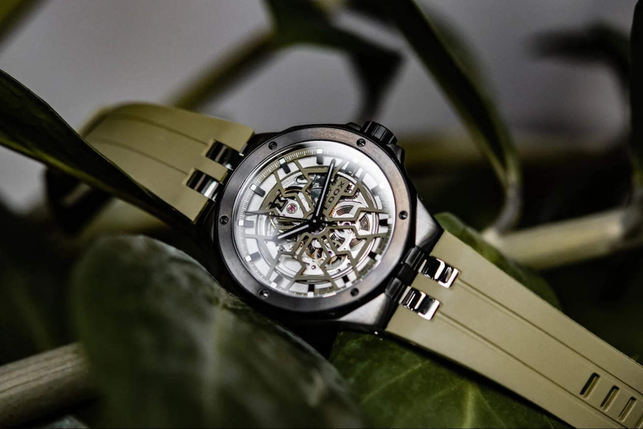 Edox Delfin The Original Mecano Automatic 85303-357GNCAV-VONB е впечатляващ мъжки часовник с модерен скелетон дизайн, 43 мм корпус от PVD стомана и зелен циферблат. Захранва се от автоматичен механизъм Caliber 853 (SW200) с прозрачен заден капак. Моделът е водоустойчив до 200 м (20 ATM) и предлага двойно уплътнена коронка, завиваща се коронка и SuperLuminova за отлична видимост. Каишката е висококачествен каучук за комфорт и спортен характер.