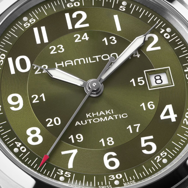 Hamilton Khaki Field Auto H70605560 е мъжки часовник, вдъхновен от военната традиция на марката, но с модерен прочит и висока техническа стойност. Корпусът от благородна стомана (42 мм) е комбиниран със зелен циферблат със слънчев ефект и луминисцентни стрелки Super-LumiNova®, осигуряващи отлична четимост. Автоматичният механизъм H-10 предоставя впечатляващ 80-часов резерв на мощност и включва антимагнитната сплав Nivachron™. Моделът разполага със сапфирено стъкло и прозрачен гръб, а каишката от телешка кожа гарантира комфорт при носене. Водоустойчивостта до 100 м го прави идеален за ежедневна активност, спорт и пътуване.
