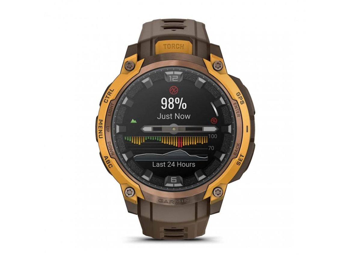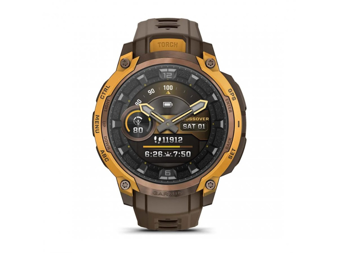 Garmin Instinct Crossover AMOLED Bronze/Sunburst 010-03398-01 е здрав и тактически GPS смарт часовник с аналогови стрелки и 1,2” AMOLED дисплей. Вградено LED фенерче, двуслоен метален безел, сапфирено стъкло, MIL-STD издръжливост и 24/7 мониторинг на здравето с Pulse Ox, HRV и сърдечен ритъм. Включва тактически функции като Stealth режим, Jumpmaster, Rucking профил и Applied Ballistics®. До 14 дни живот на батерията, multi-band SatIQ™ GPS и широка гама спортни профили. Перфектен за приключения, тренировки и тактически приложения.