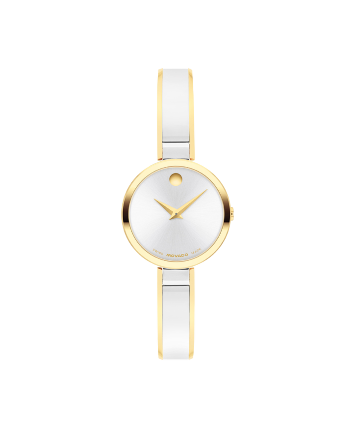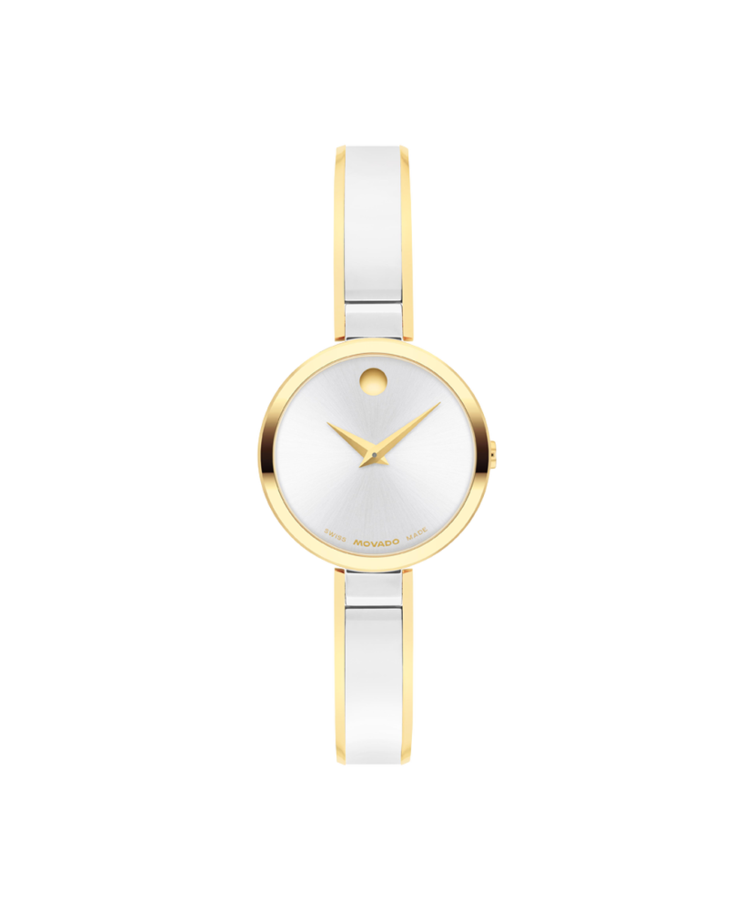 Часовник MOVADO 608012 излъчва неподвластна на времето елегантност и фин лукс. Корпусът и верижката от благороднаа стомана с жълто PVD покритие придават сияен завършек, а светлият циферблат със златиста точка в 12 часа въплъщава символа на слънцето в зенита му. Задвижван от швейцарски кварцов механизъм и защитен със сапфир кристал, този часовник е перфектният избор за дамите, които търсят изтънчен баланс между минимализъм и изисканост.