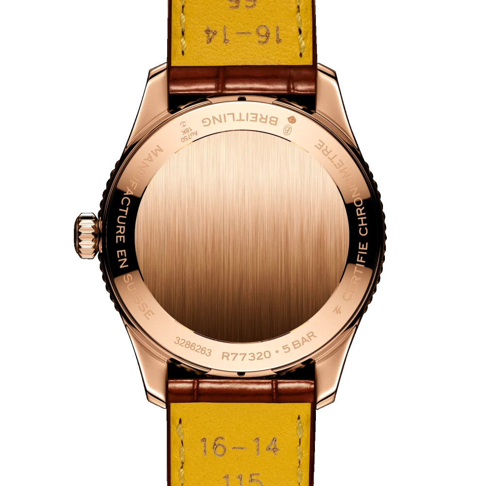 Часовник Breitling Navitimer 32 R77320E31Q1P1 е луксозен дамски модел, съчетаващ елегантност и висока швейцарска прецизност. Изработен от 18 карата розово злато, с кафяв циферблат, инкрустиран с 12 диаманта, той впечатлява с финес и изисканост. Захранван е от SuperQuartz™ калибър Breitling 82, сертифициран от COSC, с 3–4 години живот на батерията. Сапфирено стъкло, 50 м водоустойчивост и каишка от алигаторска кожа завършват класическия премиум стил.