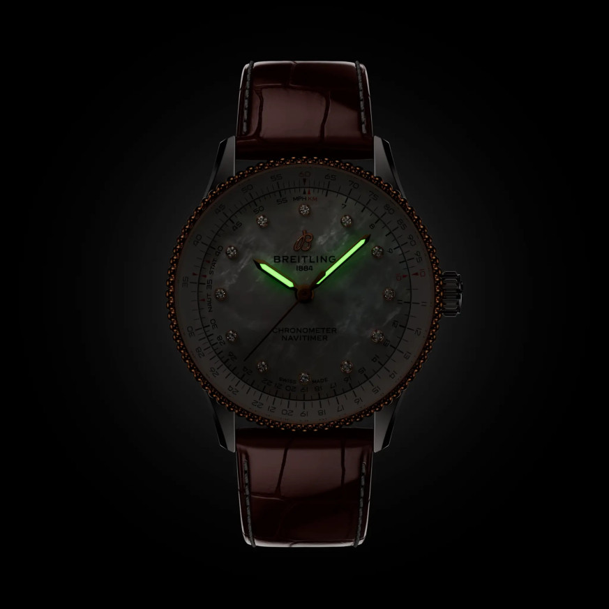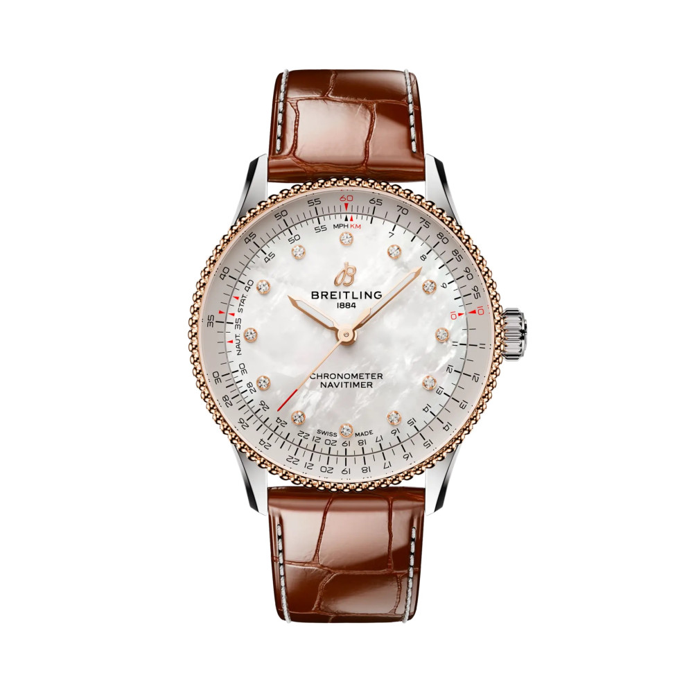 Часовник Breitling Navitimer Automatic 36 U17327211A1P1 е изискан дамски модел, който съчетава елегантност и традиция. С корпус от стомана и 18К розово злато, перлен циферблат с 12 диаманта и автоматичен механизъм Breitling 17 (COSC сертифициран), той предлага не само стил, но и висока точност. Двупосочният безел със slide rule функция позволява извършване на математически изчисления. Каишката от алигатор и сапфиреното стъкло с антирефлексно покритие завършват усещането за лукс.