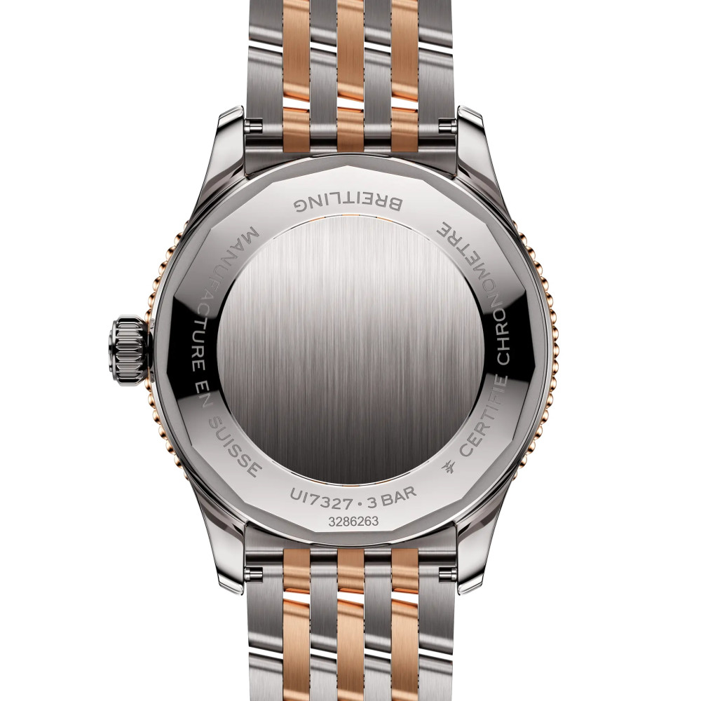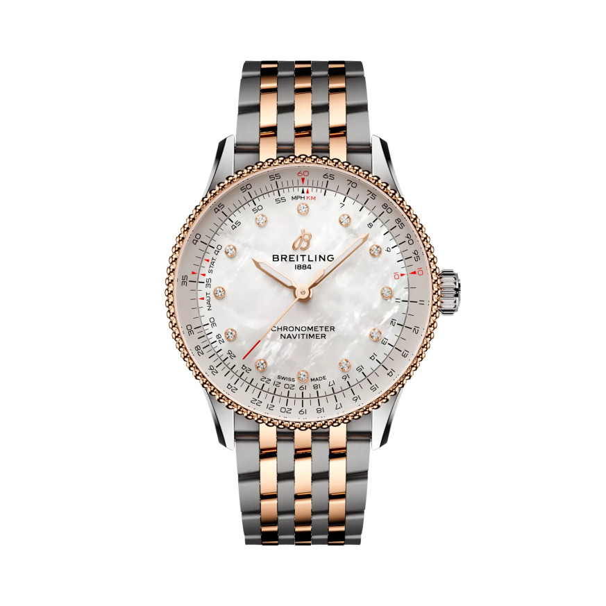 Часовник Breitling Navitimer Automatic 36 U17327211A1U1 е изключителен дамски модел, съчетаващ лукс и функционалност. С корпус от стомана и 18К розово злато, перлен циферблат с 12 диаманта и автоматичен механизъм Breitling 17 (COSC сертифициран), той е символ на прецизност и елегантност. Двупосочният безел със slide rule функция позволява извършване на математически изчисления, което прави този часовник уникален. Сапфирено стъкло, 30 м водоустойчивост и стоманено-златна верижка завършват луксозния облик.