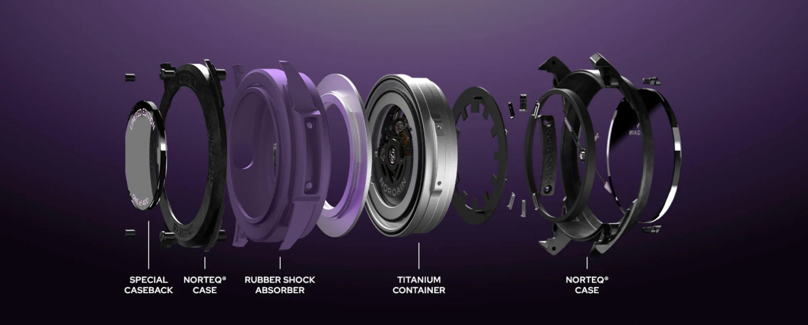 Материалът NORTEC® е ултралек и изключително здрав композит, създаден ексклузивно за марката NORQAIN в сътрудничество с Jean-Claude Biver и BIWI SA. Този високопроизводителен материал има впечатляващ мраморен ефект и предлага идеален баланс между плътност, еластичност и устойчивост за оптимално абсорбиране на удари.