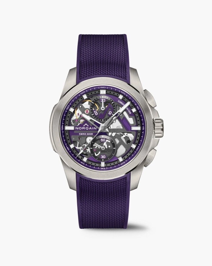 Часовник NORQAIN Independence Skeleton Chrono 42mm N3200.40T03.P01 комбинира авангардна визия с швейцарска механична съвършеност. Изработен от титан Grade 5, този COSC-сертифициран Flyback хронограф разкрива своя NORQAIN 8K Manufacture Calibre (NK24/1) чрез скелетонизиран черно-лилав циферблат. С 62 часа резерв на енергия и интегрирана лилава каишка с милански релеф, моделът въплъщава динамика, стил и иновация – истинско инженерно произведение за ценители.