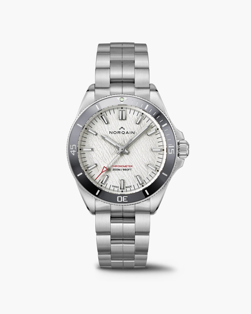 Часовник NORQAIN NEVEREST Glacier 40mm N1001.21S07.W01 е вдъхновен от мощта и величието на Хималаите. Белият циферблат с текстура, напомняща ледени пукнатини, съчетава естетика и приключенски дух. В сърцето му работи мануфактурен механизъм NN20/1 от Kenissi, сертифициран по COSC с резерв на енергия от 70 часа. 10% от печалбата от продажбите се даряват на Butterfly Help Project – кауза в подкрепа на шерпите от Непал.
