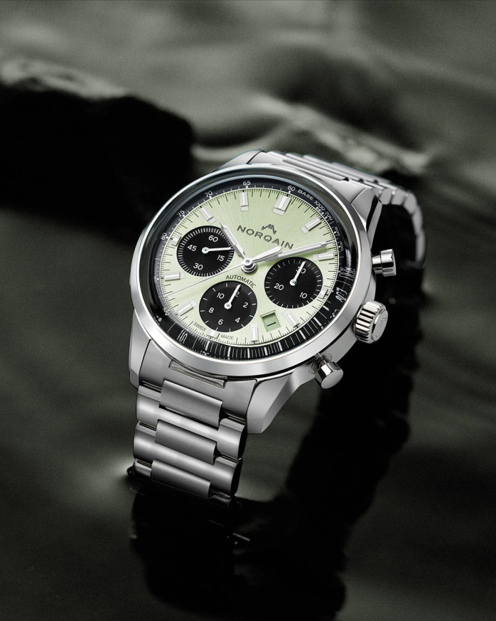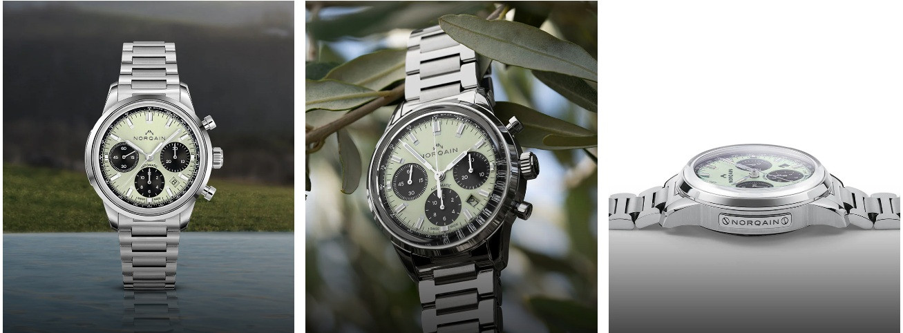 Часовник NORQAIN Freedom 60 Chrono 40mm N2201.19S01.E01 впечатлява със своя пистачо циферблат със sunray ефект и три черни хронографски брояча. Автоматичният механизъм N19 (SW510 a) предлага 62 часа резерв и функции за секунди, 30-минутен и 12-часов брояч, както и дата между 4 и 5 часа. Корпусът от неръждаема стомана е съчетан със сапфирено стъкло и водоустойчивост до 100 м. Моделът предлага персонализация чрез гравюра върху плочката NORQAIN, превръщайки го в уникален и индивидуален аксесоар.