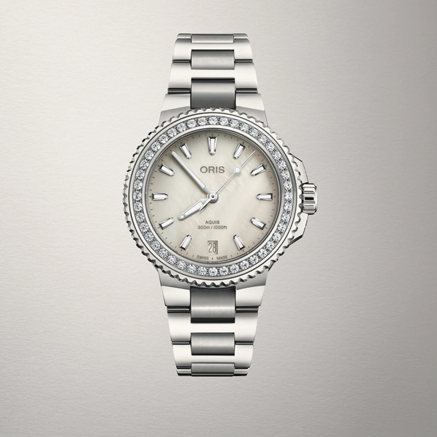Oris Aquis Date Lab Diamond 36.5 733 7792 4956-07 8 19 05P е луксозен дамски часовник, който съчетава елегантност и издръжливост. Със своите 44 лабораторно отгледани диаманта и светъл седефен циферблат, този часовник притежава уникален и неповторим луксозен характер. Корпусът и верижката от благородна стомана осигуряват стил и надеждност, а автоматичният механизъм Oris 733 предлага прецизност и ефективност. Моделът разполага с функции за час, минути, секунди и дата, а водоустойчивостта до 30 ATM (300 м) го прави подходящ за всякакви водни активности. Oris Aquis Date Lab Diamond е идеален избор за дамите, които търсят съвършенството в лукса и функционалността.