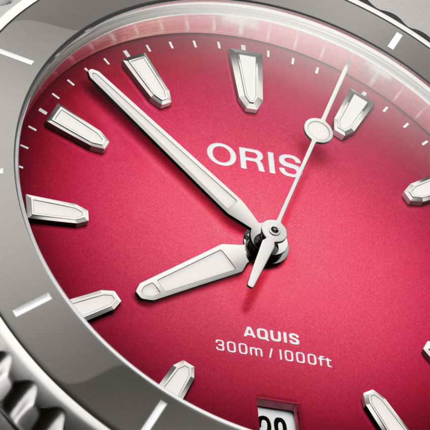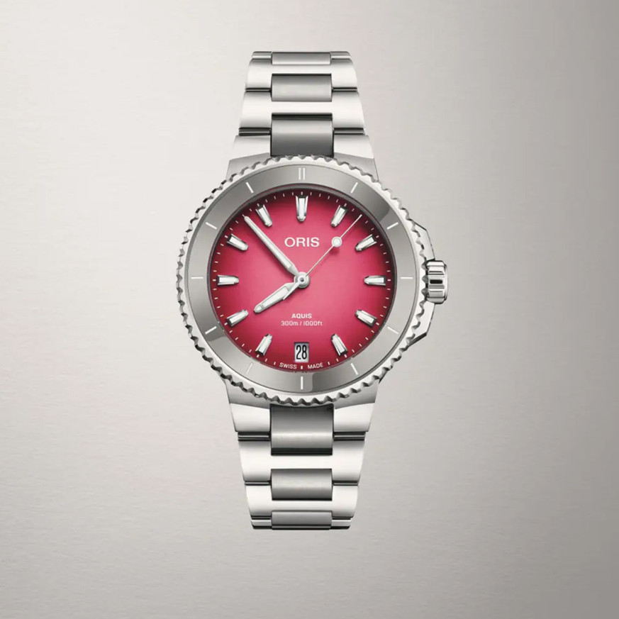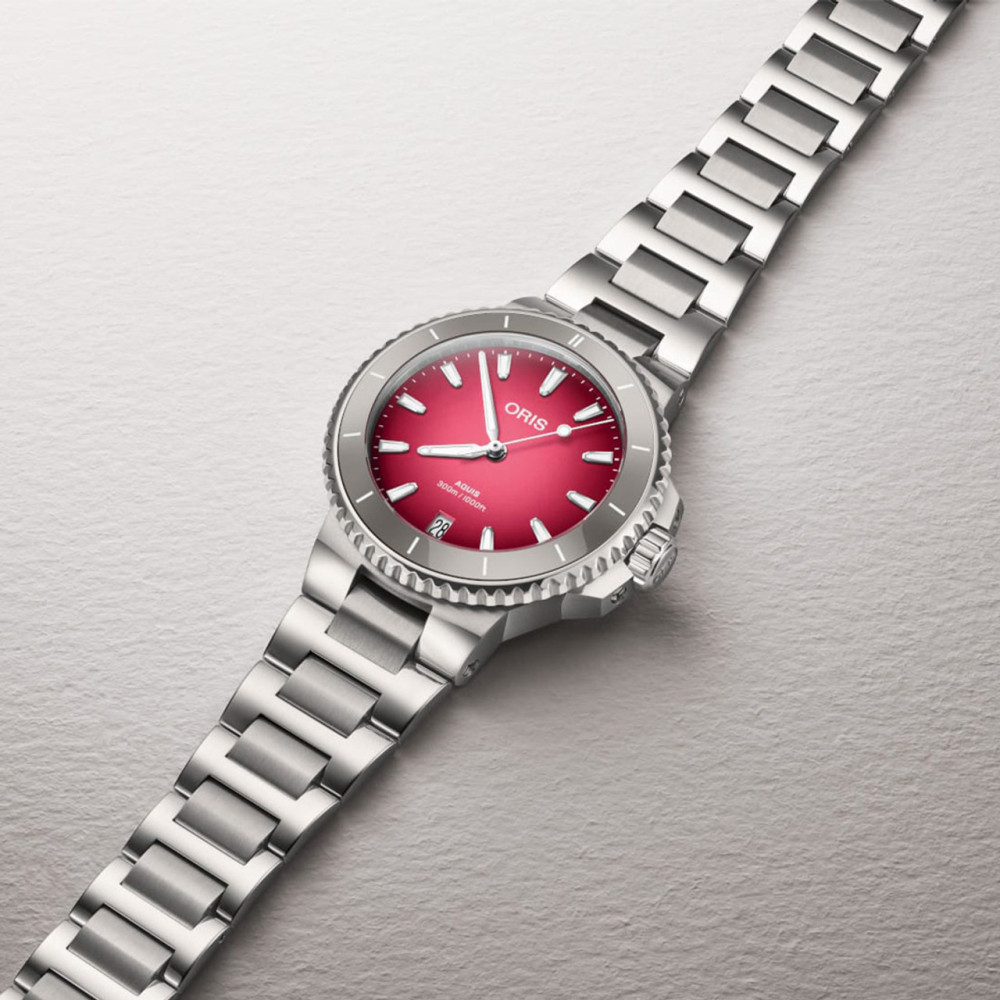 Oris Aquis Date “Taste of Summer” 733 7792 4158-07 8 19 05P е дамски часовник, който съчетава спортния дух с луксозна елегантност. С ярък градиентен циферблат, преход от червено към розово, този модел привлича погледите и излъчва свежест, напомняща за дългите летни дни в Алпите. Корпусът от благородна стомана и керамичният безел осигуряват висока издръжливост, а сапфиреното стъкло с анти-рефлексно покритие гарантира дълготрайна защита. Часовникът е задвижван от автоматичния механизъм Oris Calibre 733, базиран на Sellita SW200-1, с 41 часа резерв на мощност. С водоустойчивост до 300 м (30 ATM) и Super-LumiNova покритие на стрелките и индексите, Oris Aquis Date “Taste of Summer” е перфектен избор за динамични и активни дами.