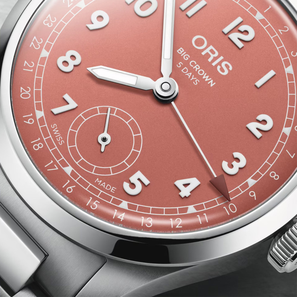 Oris Big Crown Pointer Date Calibre 403 разполага с диаметър от 40 мм и благородна стомана за корпуса, а циферблатът в терракотен цвят добавя уникален и елегантен акцент. С метална верижка и Oris разработена катарама, която приляга перфектно на китката, този часовник предлага комфорт и стил за динамичния модерен човек.