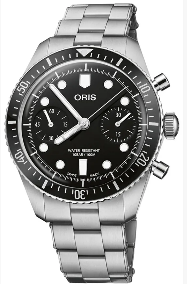 Часовник Oris Divers Sixty-Five Chronograph 01 771 7791 4054-07 8 20 18 е елегантен 40-милиметров автоматичен хронограф, вдъхновен от оригиналния модел от 60-те години. Корпусът от благородна стомана и куполното сапфирено стъкло с антирефлексно покритие осигуряват издръжливост и ретро излъчване. Черният циферблат с два подциферблата и въртящ се безел придават спортна динамика. Механизмът Oris Calibre 771 предлага 62 часа резерв и безупречна прецизност. Водоустойчивост 100 м – идеален за ежедневие и приключения.