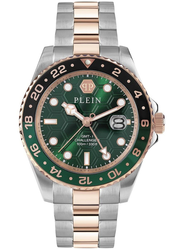 Philipp Plein PWYBA0623 от серията GMT-I Challenger е създаден за съвременния авантюрист – модел, който съчетава атлетичност и лукс. Часовникът се отличава с корпус и верижка от неръждаема стомана с частично златисто IP покритие и зелен циферблат, който подсилва усещането за приключение. Функцията за втора часова зона го прави перфектен за пътуване и динамичен начин на живот. Водоустойчивостта до 100 метра и здравото минерално стъкло гарантират надеждност във всякакви условия.