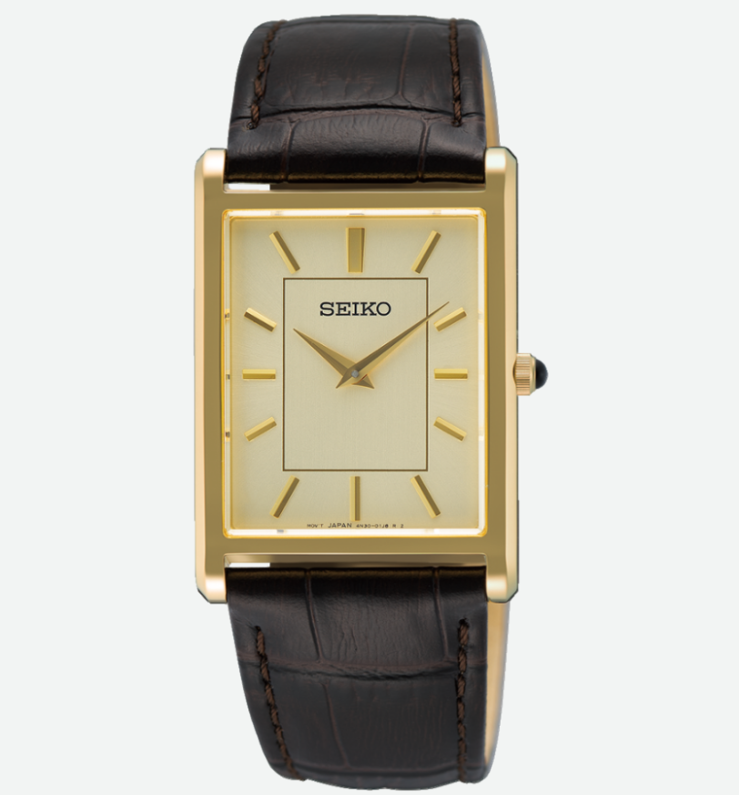 Часовник Seiko SWR106P1 е елегантен мъжки кварцов модел от серията Classic, съчетаващ изчистен дизайн и неподвластна на времето естетика. Корпусът е изработен от неръждаема стомана с диаметър 28 мм и покритие в златен цвят, а черният циферблат с римски индекси и златисти стрелки придава луксозен и изтънчен вид. Механизмът 4N30 осигурява надеждна точност, а Hardlex стъклото и кафявата кожена каишка гарантират комфорт и издръжливост – перфектният избор за мъже с класически стил.
