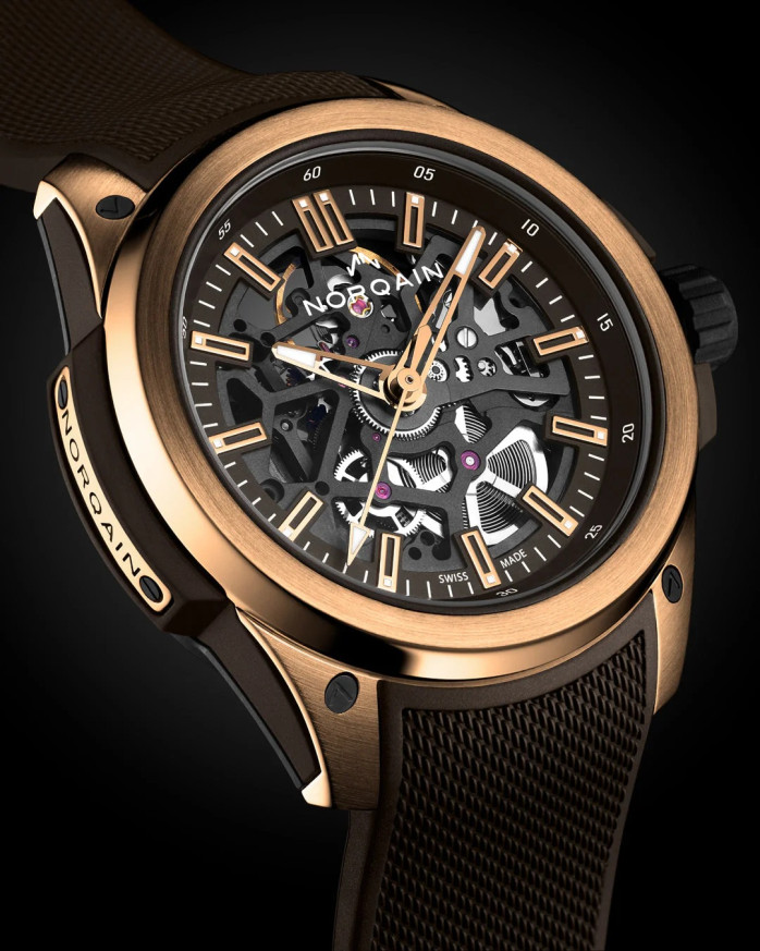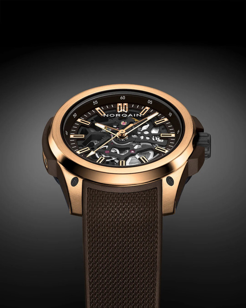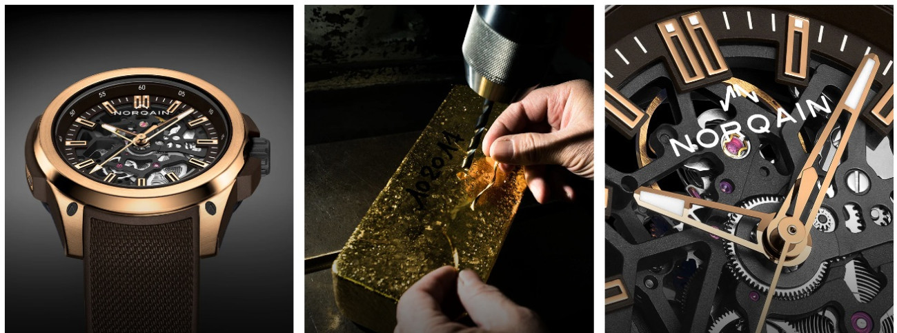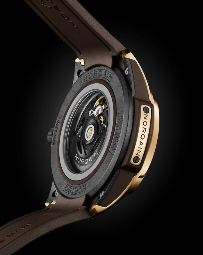 Горната част на революционния 42-милиметров корпус е изработена от масивно 18-каратово червено злато с матова и полирана повърхност, докато основата е създадена от черен NORTEQ® – високотехнологичен материал, ексклузивен за NORQAIN.