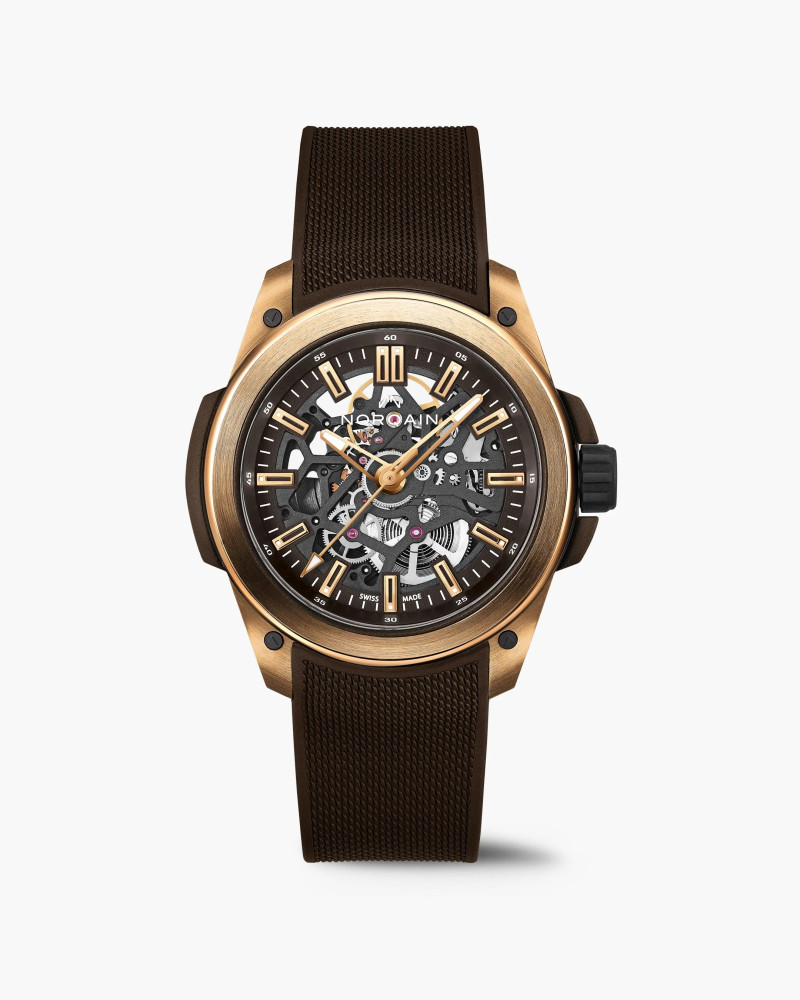 Часовник NORQAIN Wild ONE Skeleton 42mm Gold N3000.07G04.N01 е лимитиран шедьовър, съчетаващ 18К червено злато, NORTEQ® корпус и авангарден скелетон дизайн. С автоматичен механизъм NORQAIN Calibre NB08S (COSC сертифициран), прозрачен гръб и водоустойчивост 200 м, този модел е създаден за ценители на иновациите и престижа. Индекси и стрелки с X1 Super-LumiNova® гарантират перфектна четимост, а каишката от интегрирана кафява гума придава комфорт и елегантност. Изключителен часовник за колекционери и личности с характер.