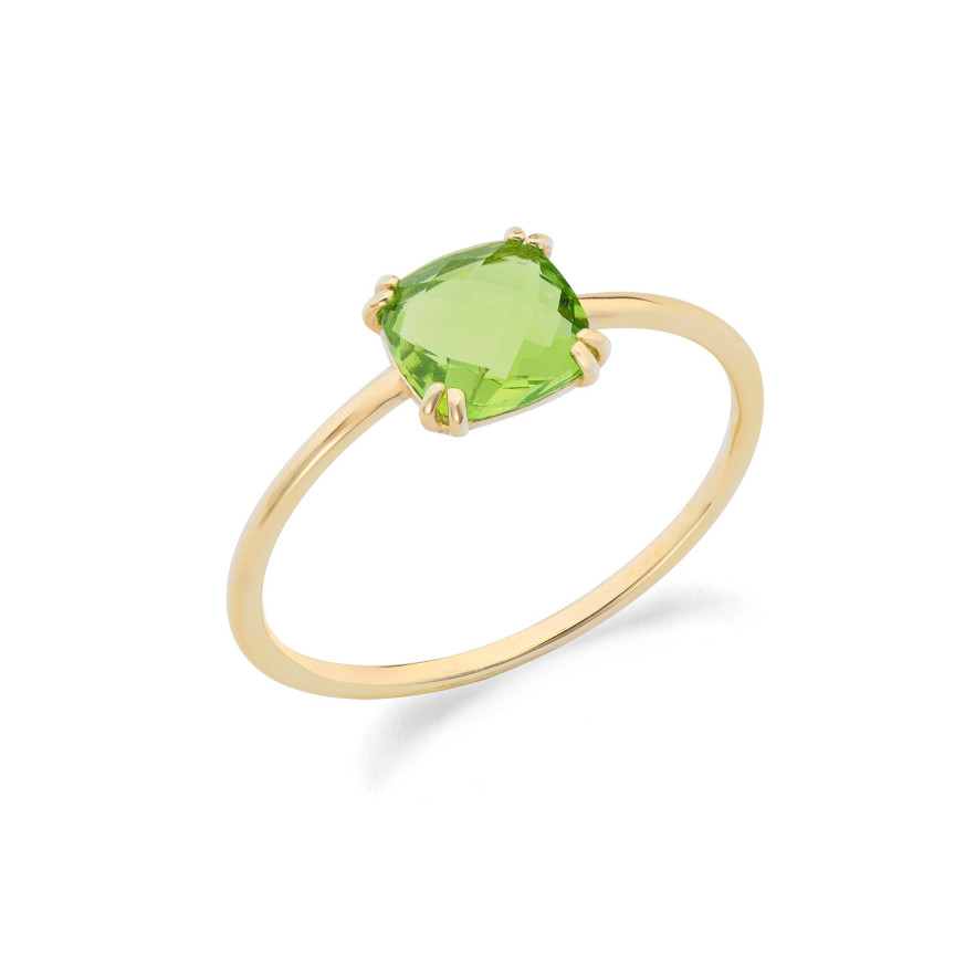Елегантен и изискан пръстен, изработен от жълто злато 375‰ със сияен фасетиран кристал перидот, инкрустиран с четири зъбеца за подсилване на блясъка му. Минималистичният дизайн на обковката го прави идеален за самостоятелно носене или в комбинация с други пръстени за създаване на изискани и модерни визии. Произведен в Италия.