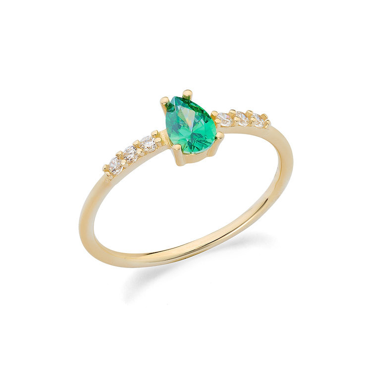 Изискан и сияен пръстен, изработен от жълто злато 375‰ с централен камък с крушовидна шлифовка, инкрустиран със зъбци, за да подчертае блясъка му. Тънката халка е украсена с ред бели циркониеви камъни, които добавят нотка на блясък и изтънченост. Идеален за самостоятелно носене за елегантен вид или в комбинация с други бижута за по-изтънчен стил. Произведен в Италия.