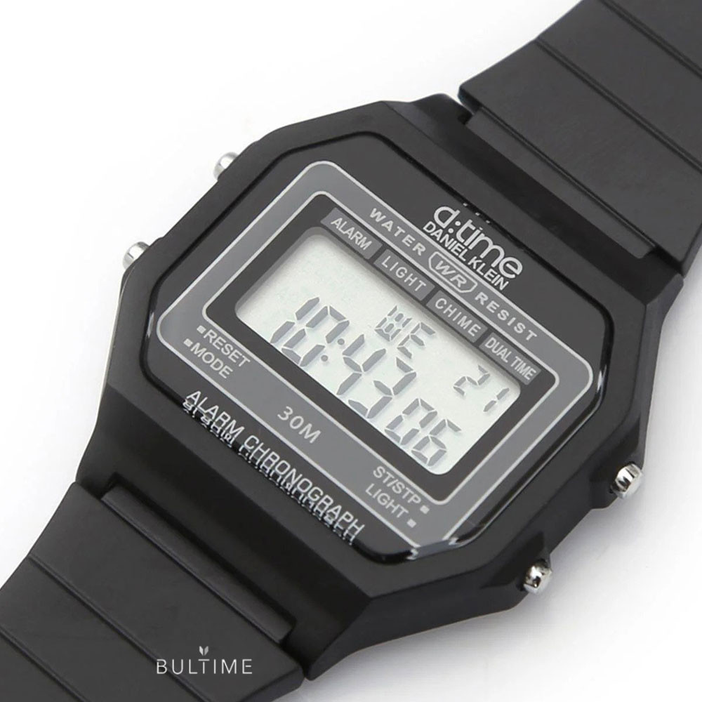Спортен модел дамски часовник Daniel Klein от колекцията D Time. Часовникът е с корпус от полимер и силиконова каишка. Дигитален дисплей с плексигласово стъкло.  Моделът има следните функции: показател за дата и ден от седмицата, 12/24 часов формат, второ време, хронограф, аларма и осветяване на дисплея. Задвижва се от кварцов механизъм. Водоустойчивост 3 ATM - допускат се леки пръски, не се препоръчва обилно мокрене.