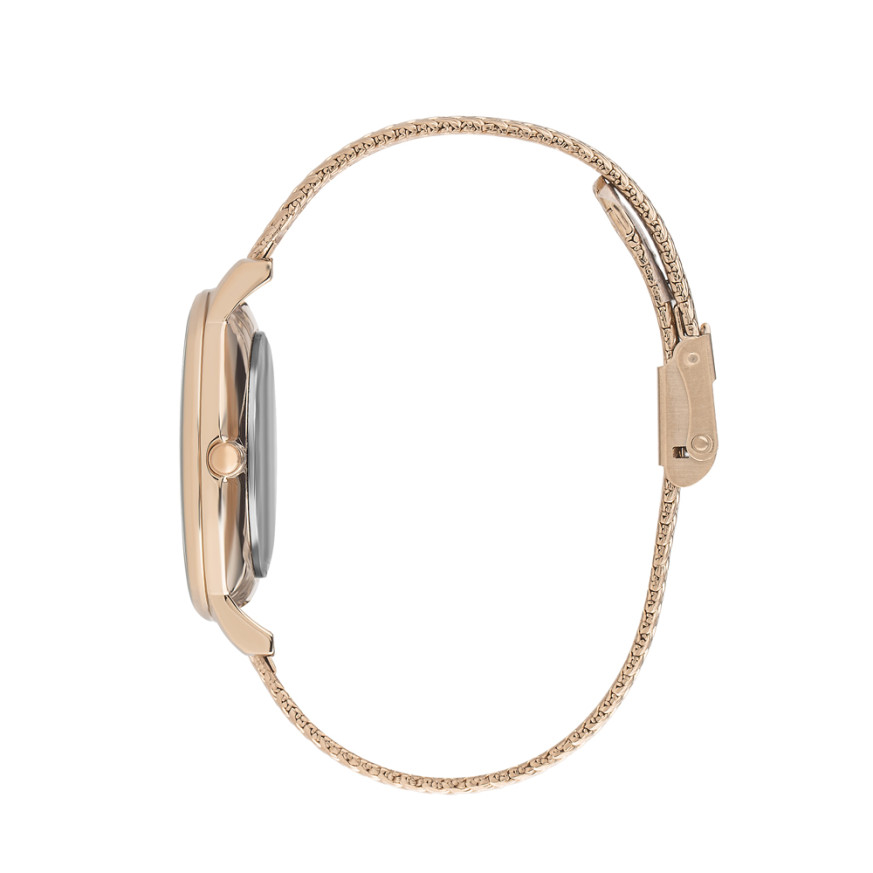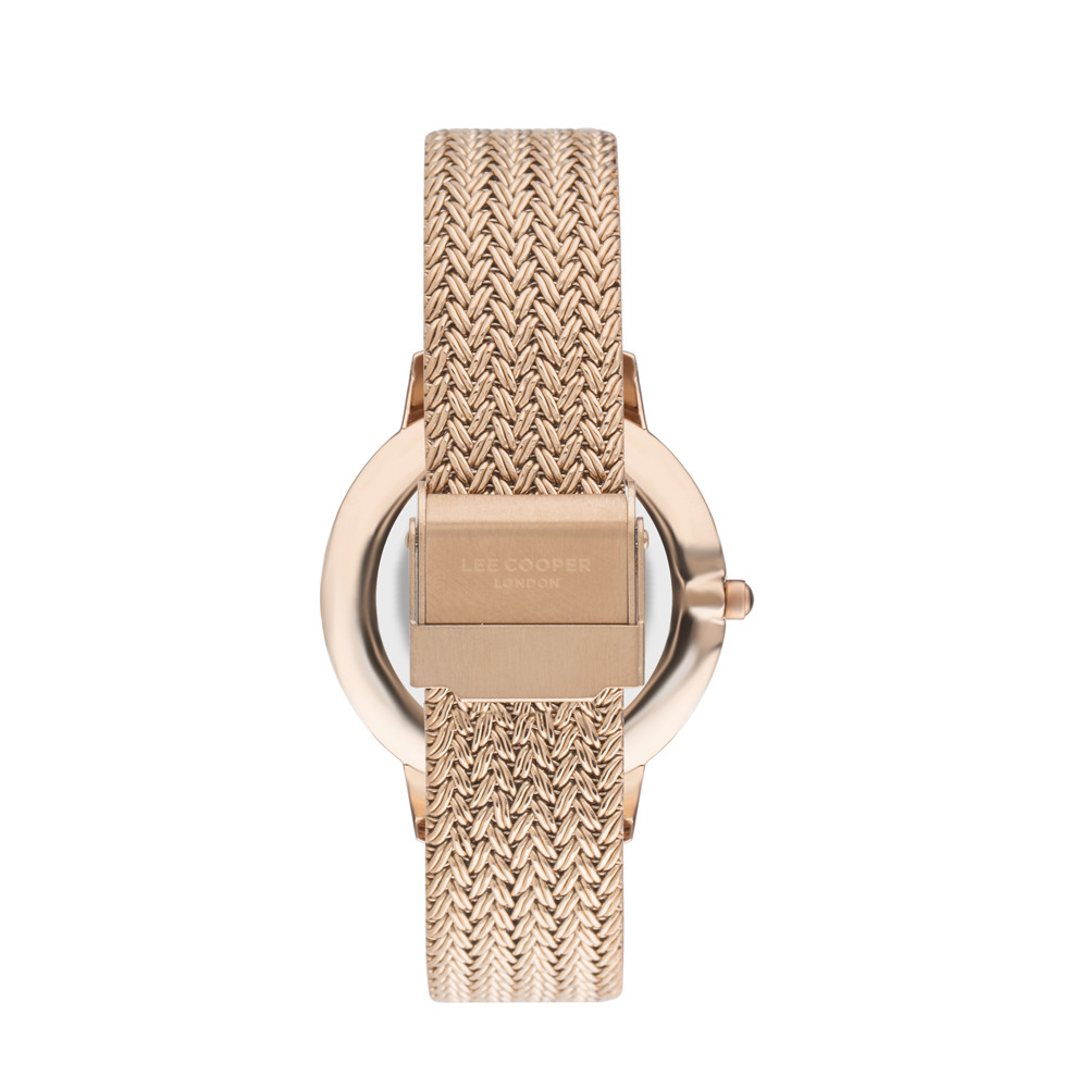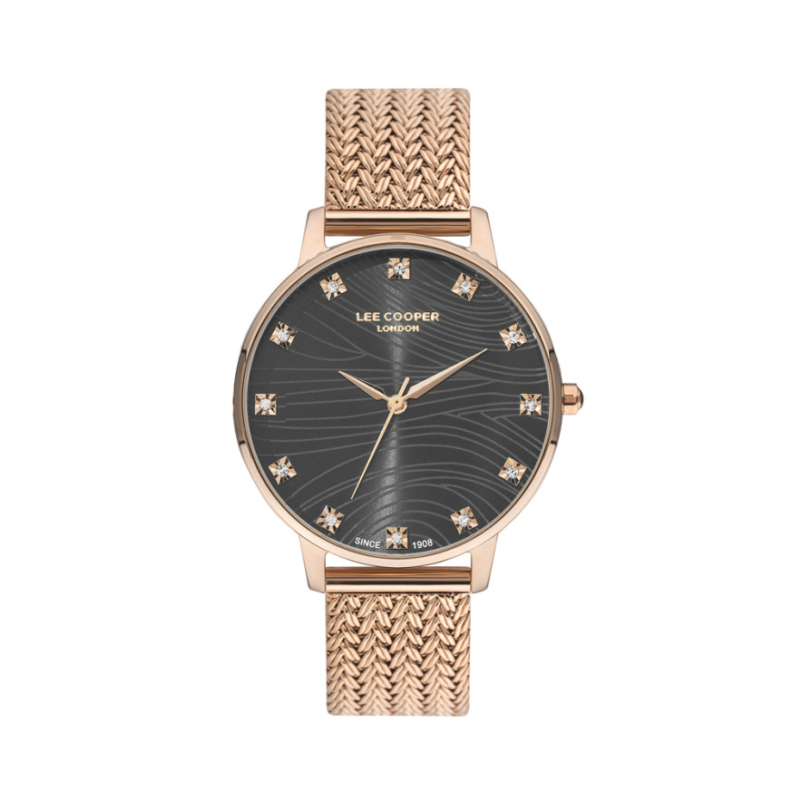 Нежен модел дамски часовник Lee Cooper. Корпусът е изработен от специална сплав - супер метал и е с минерално стъкло. Меш верижка в цвят розово злато. Аналогов седефен дисплей в черен цвят с декорация от инкрустирани кристали. Кварцов механизъм. Водоустойчивост 3 ATM - допускат се леки пръски, не се препоръчва обилно мокрене.