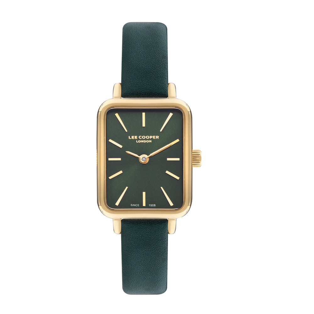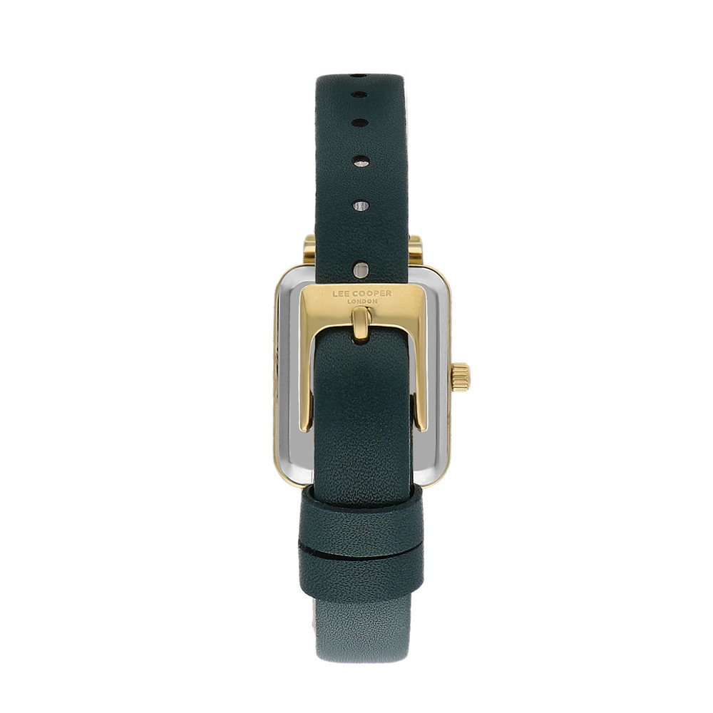 Дамски часовник Lee Cooper с елегантен дизайн. Масленозелен циферблат със стрелки и индекси в цвят злато. Стъкло минерал-кристал. Корпус изработен от супер метал. Каишка от естествена кожа. Часовникът се задвижва от кварцов механизъм. Водоустойчивост 3 ATM - допускат се леки пръски, не се препоръчва обилно мокрене.