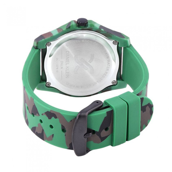 Спортен модел мъжки часовник Daniel Klein. Аналогов дисплей в зелен камуфлажен цвят с централно разположено лого и показател за дата. Стъкло минерал-кристал. Корпус изработен от висококачествен полимер, съчетан със силиконова каишка. Задвижва се от кварцов механизъм. Водоустойчивост на часовника 3 ATM - допускат се леки пръски, не се препоръчва обилно мокрене.