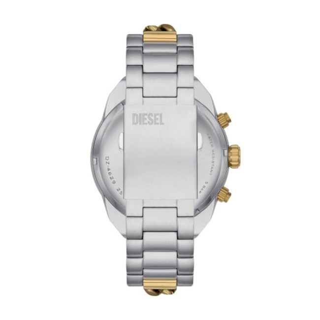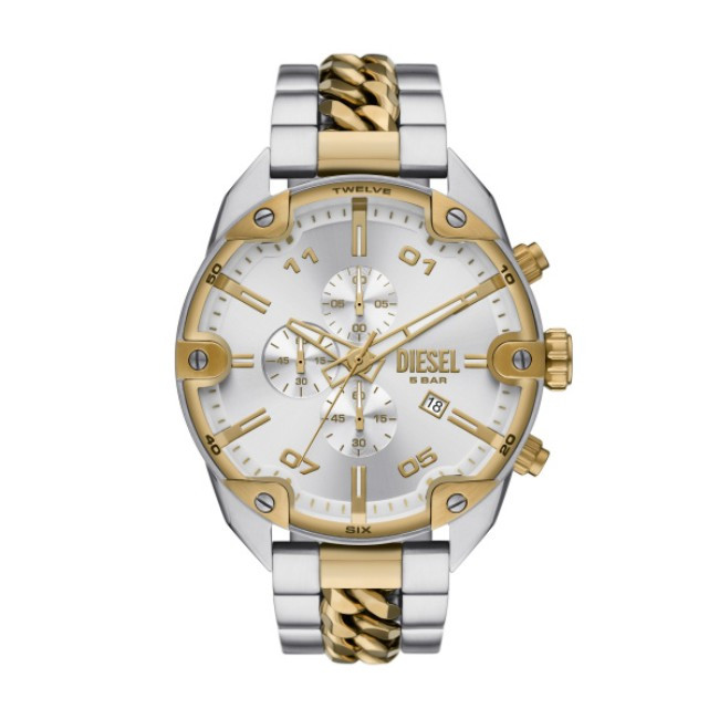 Мъжки Часовник Diesel DZ4629 Diesel DZ4629 от колекция Spiked e мъжки кварцов часовник със сребрист кръгъл циферблат, сребрист корпус от неръждаема стомана с диаметър 49 mm и двуцветна верижка 24 mm, изработена от неръждаема стомана.