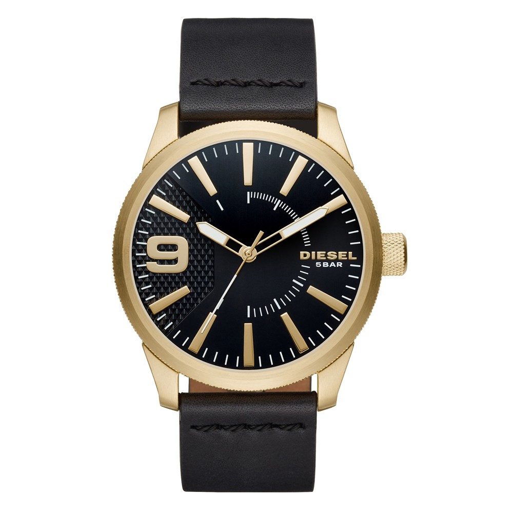 Diesel DZ1801 Rasp е стилен мъжки аналогов часовник, съчетаващ изисканост с издръжливост. Корпусът с диаметър 46 мм е покрит със златист PVD, комбиниран с черен sunray циферблат, на който изпъква голямата цифра "9" и индикатор за 5 Bar (50 м) водоустойчивост .