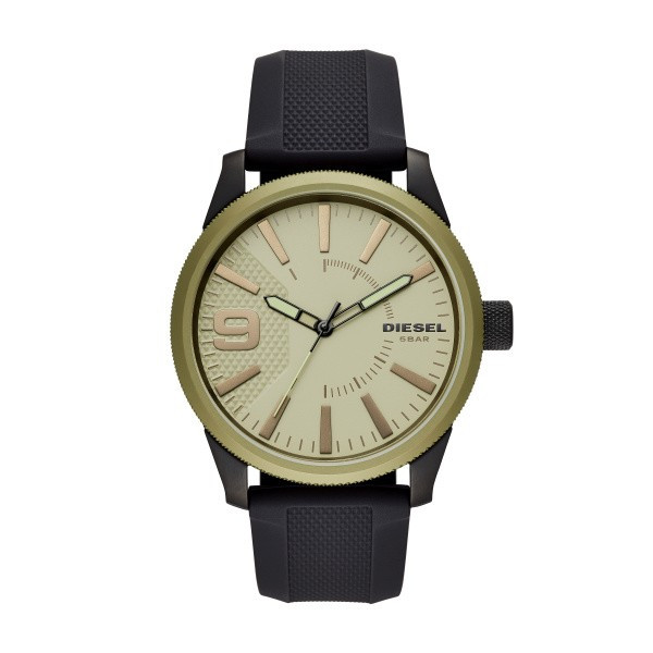 Diesel DZ1875 Rasp (Rasp NSBB серия) е модерен и практичен мъжки часовник с корпус Ø46 мм, който впечатлява с контраста между черен алуминиев корпус и светлоголяма (beige-gold) bezel. Часовникът залага на удобна черна силиконова каишка, подходяща за ежедневна употреба. На чаровния циферблат се откриват ясно четими луминесцентни стрелки и надпис „DIESEL“, както и характерната за Rasp голяма цифра „9“ .