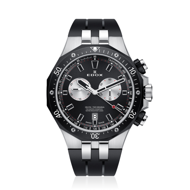 Часовник Edox Delfin Chronograph 10109 357NCA NINRO е мъжки кварцов модел, вдъхновен от оригиналната Delfin колекция от 1965 г. С изключителна водоустойчивост до 200 метра, черен циферблат и хронограф функции, той съчетава винтидж дух с модерна технология и спортен характер.