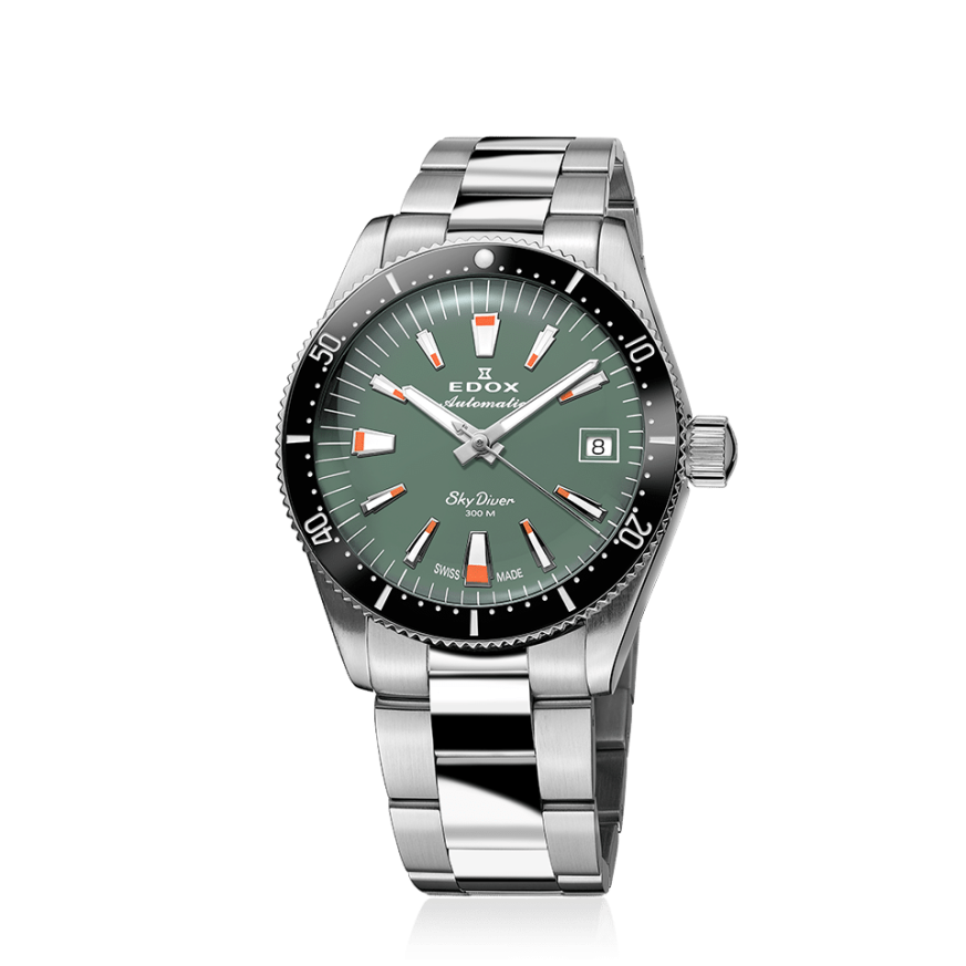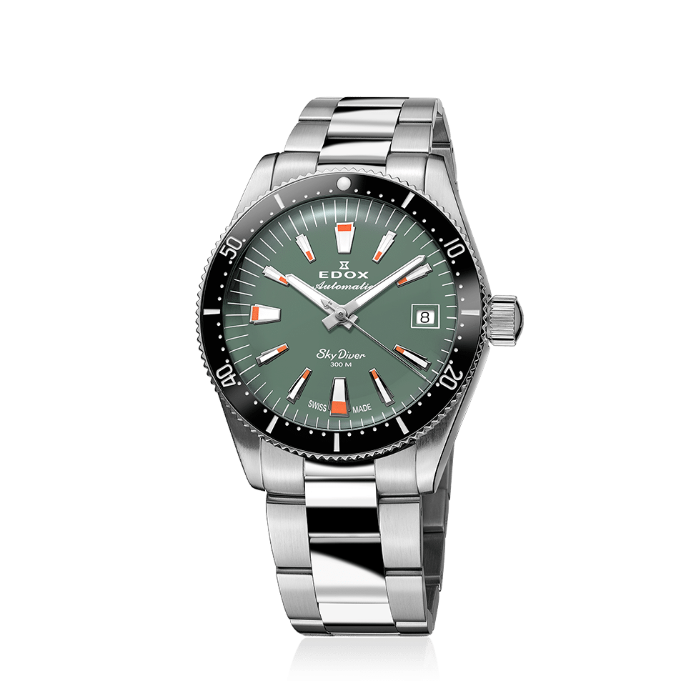 Edox Skydiver 80131 3NM VI е автоматичен унисекс часовник с корпус от 38 мм, проектиран за динамични хора, които търсят надеждност, водоустойчивост и стил. Зеленото циферблатно покритие, в комбинация с керамичен безел и сапфирено стъкло, създават впечатляващ баланс между елегантност и здравина. Автоматичният механизъм на база Sellita SW200 предлага надеждна точност и функция за дата, а верижката от стомана с двойна сгъваема закопчалка допринася за комфорт при носене. Водоустойчив до 300 м, моделът е подходящ за гмуркане, спорт и всекидневна употреба.