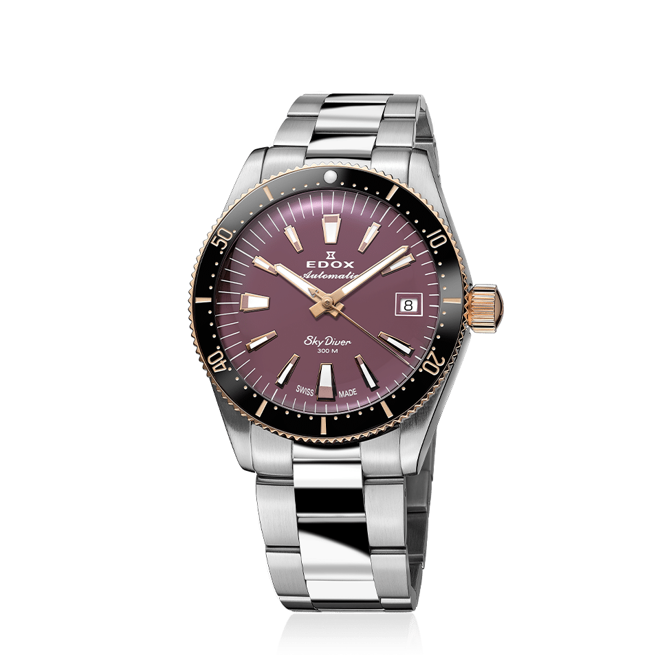 Edox Skydiver Date Auto 80131 357RNRM VIO е унисекс автоматичен часовник с компактен 38 мм корпус, който съчетава спортна елегантност и швейцарска прецизност. Създаден за любителите на активния стил и подводните приключения, този модел разполага с устойчив на надраскване сапфир-кристал, керамичен безел и водоустойчивост до 300 м (30 ATM). Пурпурният циферблат с розово-златни стрелки придава отличителен характер, а автоматичният швейцарски механизъм Sellita SW200 осигурява 38 часа резерв на мощност. Верижката от благородна стомана и завинтващата се коронка гарантират здравина и комфорт при носене. Идеален избор за всеки, който цени стил, надеждност и висока издръжливост.