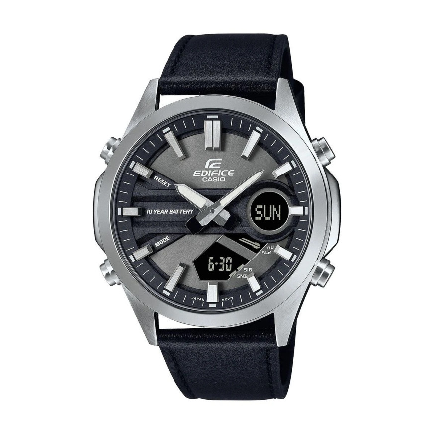 Casio EFV-C120L-8AEF съчетава аналогов и дигитален дисплей с богата функционалност, включително световно време, телемемо, 3 аларми и хронограф. Кожената каишка придава класическо излъчване, а стоманеният корпус и 10-баровата водоустойчивост го правят идеален избор за всеки ден – в офиса, в града или при пътувания.