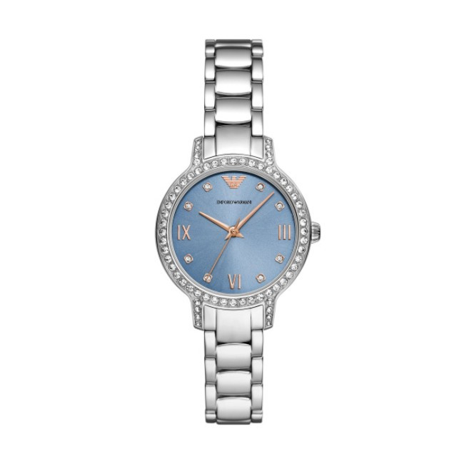Emporio Armani AR11585 “Cleo” е изискан дамски часовник, който съчетава нежност и класическа елегантност. Корпусът с диаметър 32 мм е изграден от неръждаема стомана, с фиксиран безел, декориран с искрящи кристали. Циферблатът е син sunray, с комбинация от 8 ситни кристални индекса и 4 римски символа (III, VI, IX, XII). Каишката/гривната също е изработена от сребриста неръждаема стомана, с ширина 12 мм, с фино сгъваема закопчалка. Механизмът е кварцов тристрелков, водоустойчивост 5 ATM (50 м) – подходящ за ежедневна употреба. Моделът е част от колекцията Cleo и се отличава със стил и блясък.