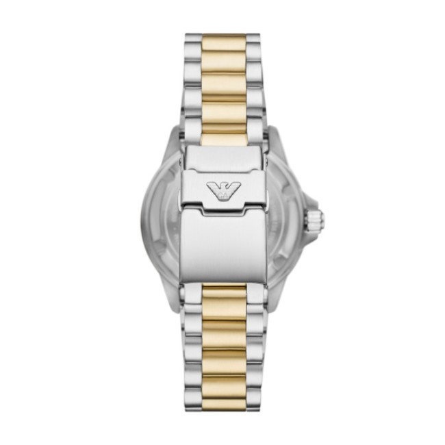 Мъжки Часовник Emporio Armani AR60089   Emporio Armani AR60089 от колекция Sea Explorer e мъжки автоматичен часовник с черен кръгъл циферблат, двуцветен корпус от неръждаема стомана с диаметър 42 mm и двуцветна верижка 22 mm, изработена от неръждаема стомана.