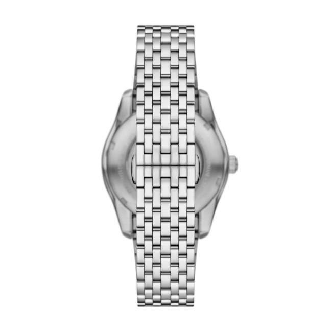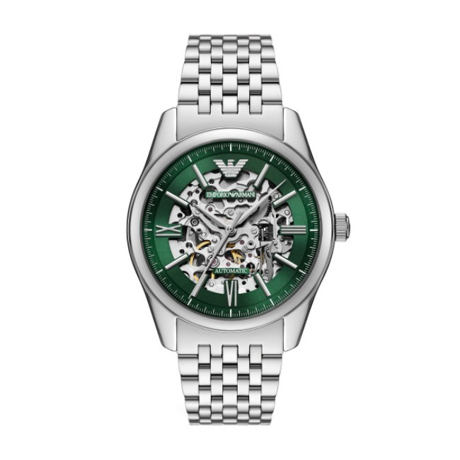 Мъжки Часовник Emporio Armani AR60091   Emporio Armani AR60091 от колекция Antonio e мъжки автоматичен часовник със зелен кръгъл циферблат, сребрист корпус от неръждаема стомана с диаметър 43 mm и сребриста верижка 22 mm, изработена от неръждаема стомана.