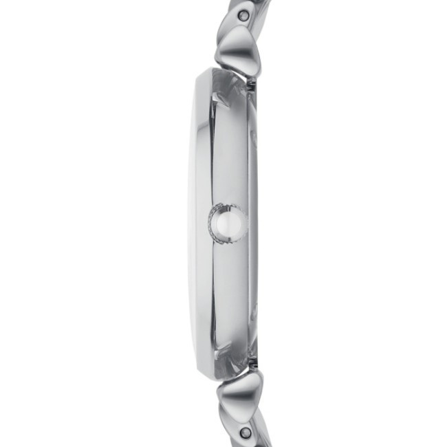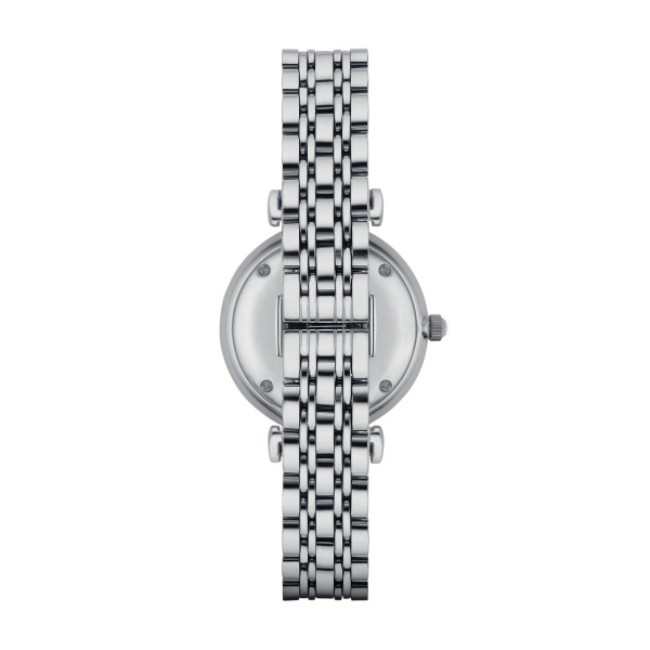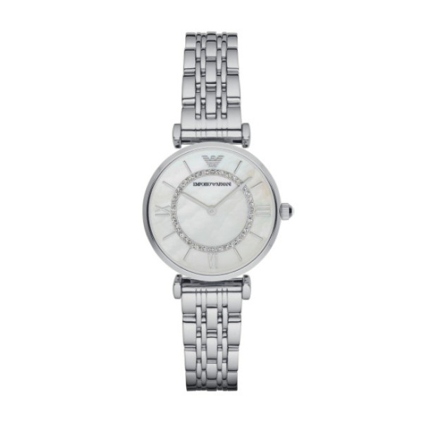 Emporio Armani AR1908 от колекция Gianni T-Bar e дамски кварцов часовник с mop кръгъл циферблат, сребрист корпус от неръждаема стомана с широчина 32 mm и сребриста верижка 14 mm, изработена от неръждаема стомана.