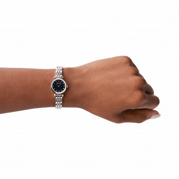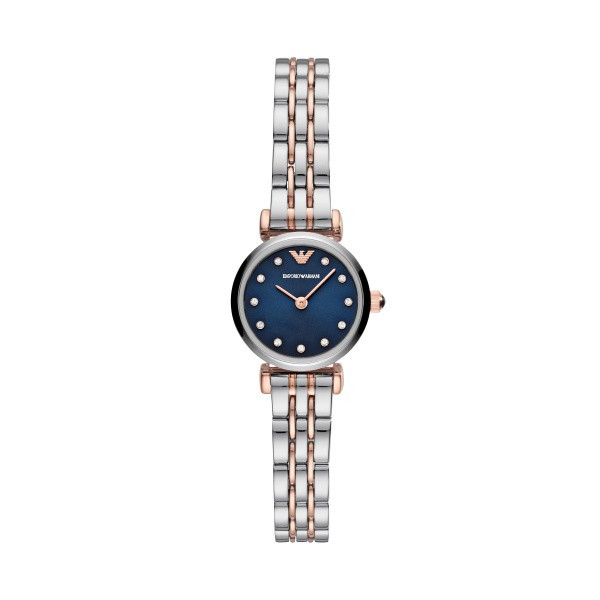 Emporio Armani AR11222 от колекция Gianni T-Bar e дамски кварцов часовник със син кръгъл циферблат, двуцветен корпус от неръждаема стомана с широчина 22 mm и двуцветна верижка 10 mm, изработена от неръждаема стомана.