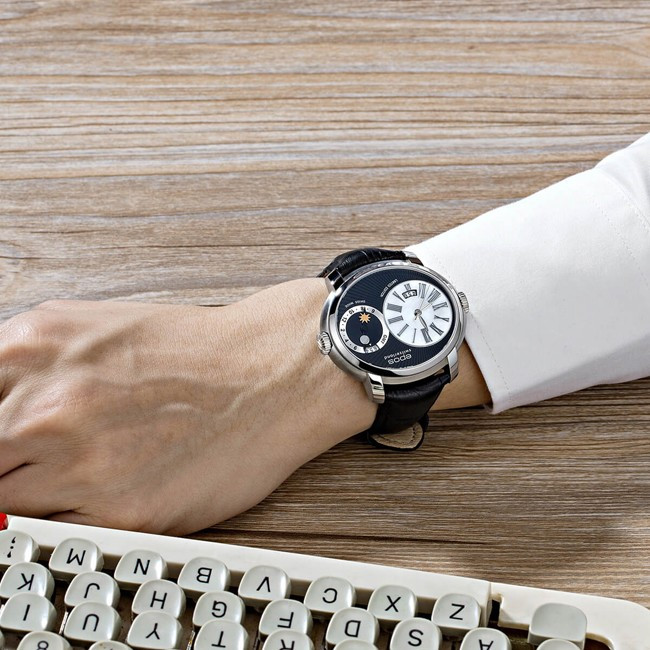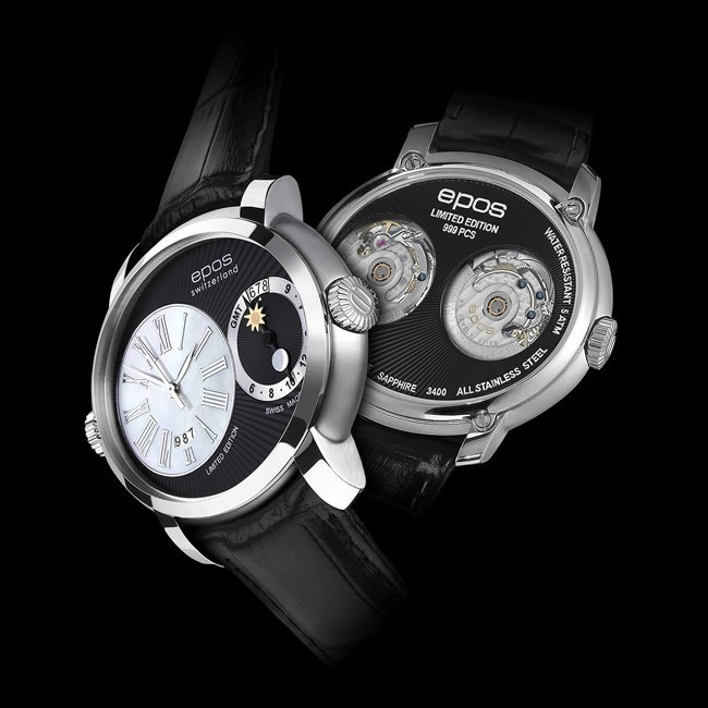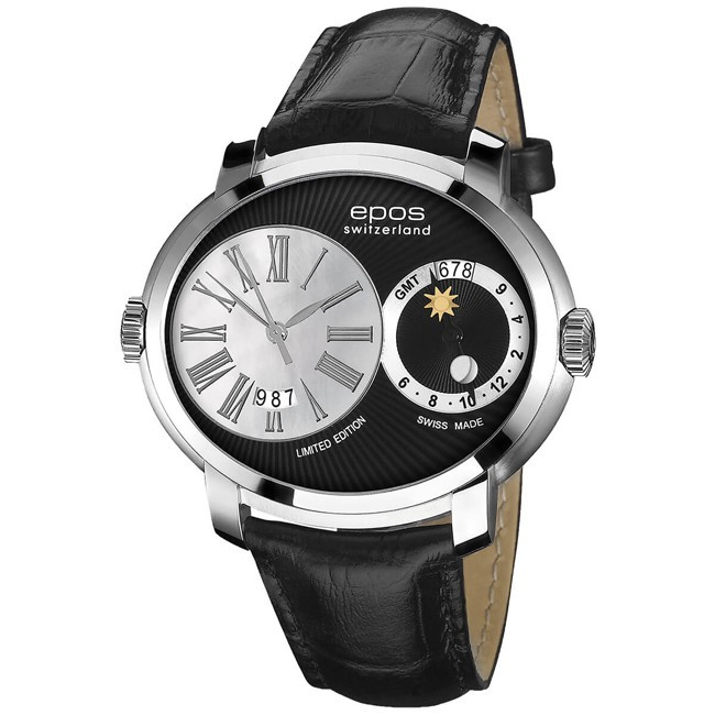 Мъжки Часовник Epos 3400.122.20.25.25 Limited Edition   Epos 3400.122.20.25.25 e мъжки автоматичен часовник с два механизма, черен овален циферблат, сребрист корпус от неръждаема стомана с диаметър 40 x 47 mm и черна каишка 22 mm, изработена от естествена кожа. Моделът е лимитиран до 999 броя, с два in-house механизма на базата на ETA 2671, с две часови зони и две дати, като движението на втората часова зона е обърнато. На гърба е със сапфирени стъкла, които открива двата Cotes de Geneve ротора, гравирани с Limited Edition номерата на модела. Многослоен циферблат със sunray финишинг и mother of pearl дистове.