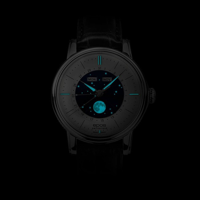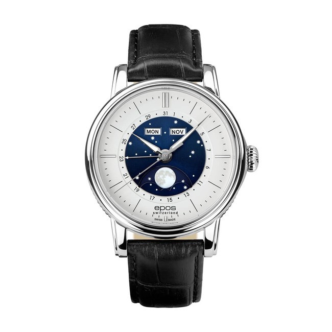 Мъжки Часовник Epos 3439.322.20.18.25 Big Moon   Epos 3439.322.20.18.25 e мъжки автоматичен часовник с бял кръгъл циферблат, сребрист корпус от неръждаема стомана с диаметър 42 mm и черна каишка 22 mm, изработена от естествена кожа. Моделът е с изключителен дизайн на циферблата с фосфоресциращи елементи, уголемена луна на лунната фаза, и с индикация на ден, дата и месец. Механизмът е in-house модификация на Sellita SW300 с перлена текстура на задната страна и C?tes de Gen?ve финишинг на ротора.