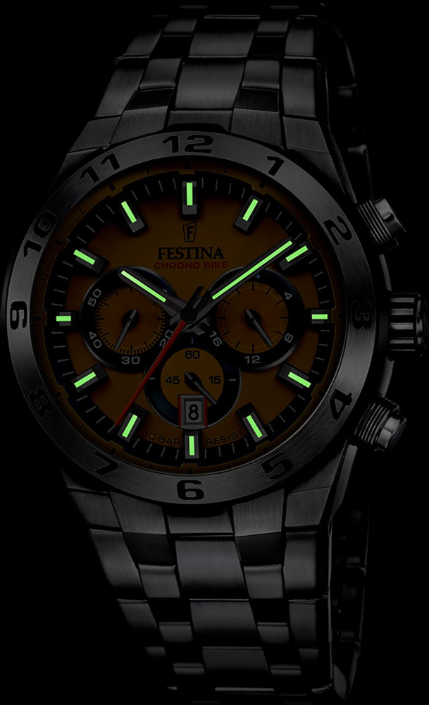 Festina F20670/4 е спортно-елегантен мъжки хронограф, част от емблематичната колекция Chrono Bike. Този модел впечатлява с жълт циферблат и Super-LumiNova покритие за отлична четимост. Корпусът от 316L медицинска стомана и водоустойчивостта до 10 ATM го правят подходящ както за динамично ежедневие, така и за активен спорт. Хронографът и датата на шест часа предлагат практичност, а стоманената верижка със сив цвят подчертава мъжествения характер на модела.