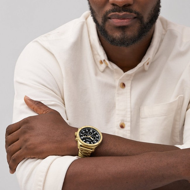 Мъжки Часовник Fossil BQ2824   Fossil BQ2824 от колекция Brox e мъжки кварцов часовник с черен кръгъл циферблат, златист корпус от неръждаема стомана с диаметър 50 mm и златиста верижка 24 mm, изработена от неръждаема стомана.
