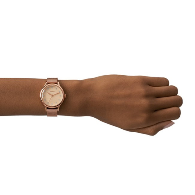 Дамски Часовник Fossil BQ3392   Fossil BQ3392 от колекция Laney e дамски кварцов часовник с розовозлатист кръгъл циферблат, розовозлатист корпус от неръждаема стомана с диаметър 34 mm и розовозлатиста меш верижка 14 mm, изработена от неръждаема стомана.