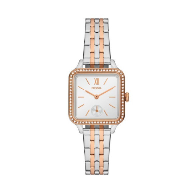 Fossil BQ3907 от колекция Colleen e дамски кварцов часовник с бял квадратен циферблат, двуцветен корпус от неръждаема стомана с широчина 28 mm и верижка 14 mm, изработена от неръждаема стомана.