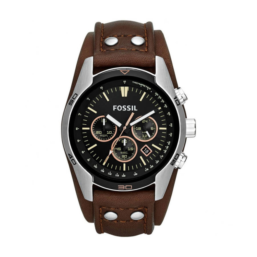 Fossil CH2891 от колекция Coachman e мъжки кварцов часовник със сребрист кръгъл циферблат, сребрист корпус от неръждаема стомана с широчина 44 mm и кафява каишка 22 mm, изработена от естествена кожа.
