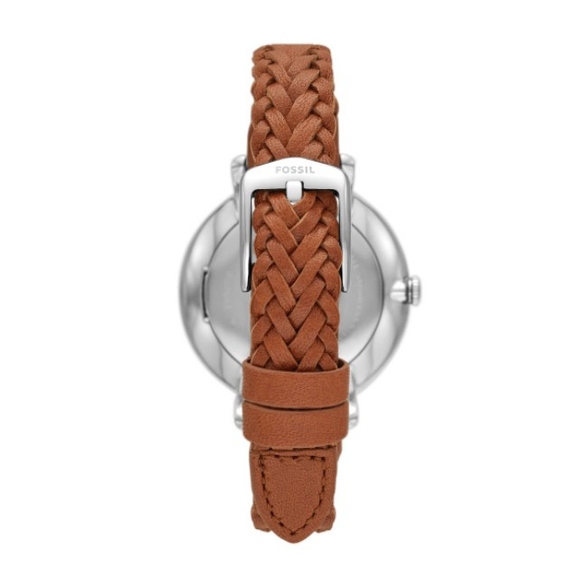 Fossil ES5208 от колекция Jacqueline e дамски кварцов часовник със сребрист кръгъл циферблат, сребрист корпус от неръждаема стомана с широчина 36 mm и кафява верижка 14 mm, изработена от неръждаема стомана.