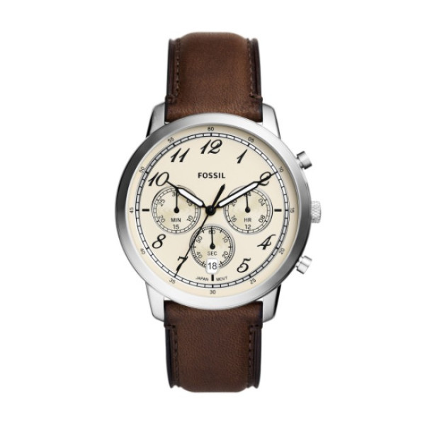 Мъжки Часовник Fossil FS6022   Fossil FS6022 от колекция Neutra e мъжки кварцов часовник с кремав кръгъл циферблат, сребрист корпус от неръждаема стомана с диаметър 44 mm и кафява каишка 22 mm, изработена от pro-planet кожа.