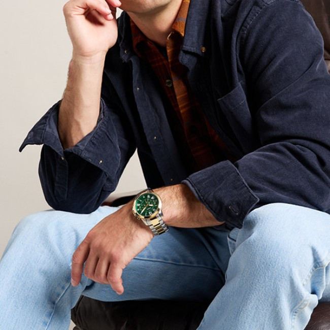 Часовник Fossil FS6131 комбинира класически дизайн и модерна функционалност. Двуцветният корпус от неръждаема стомана с диаметър 44 mm е съчетан със зелен циферблат за уникална и елегантна визия. Двуцветната верижка от неръждаема стомана с ширина 22 mm осигурява комфорт и устойчивост. Кварцовият механизъм с хронографски функции гарантира точност и надеждност. Fossil FS6131 е идеален избор за мъже, които ценят стил, практичност и индивидуалност.