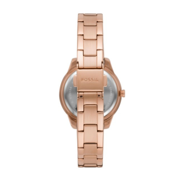 Fossil ES5136 от колекция Stella e дамски кварцов часовник с мулти кръгъл циферблат, розовозлатист корпус от неръждаема стомана с широчина 30 mm и розовозлатиста верижка 14 mm, изработена от неръждаема стомана.